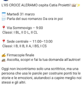 Nell’ambito del progetto “Incontro con l’autore”, martedì 31 marzo la scrittrice Catia Proietti incontrerà gli studenti del Croce Aleramo per dialogare sul romanzo “Da ora in poi”, edizioni “Albero delle matite”.
